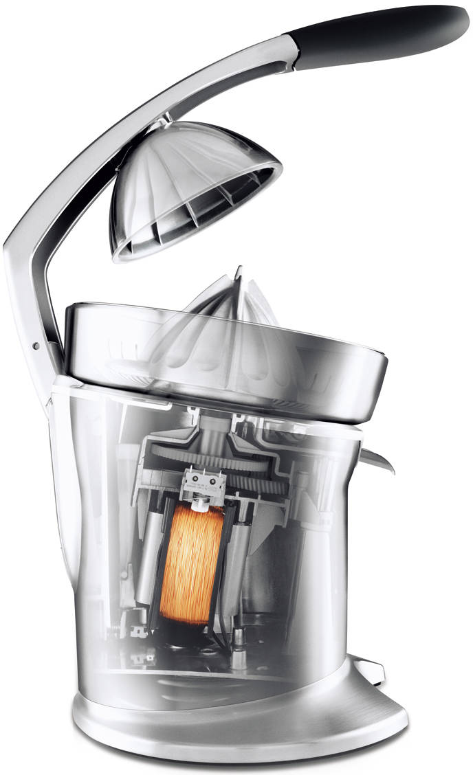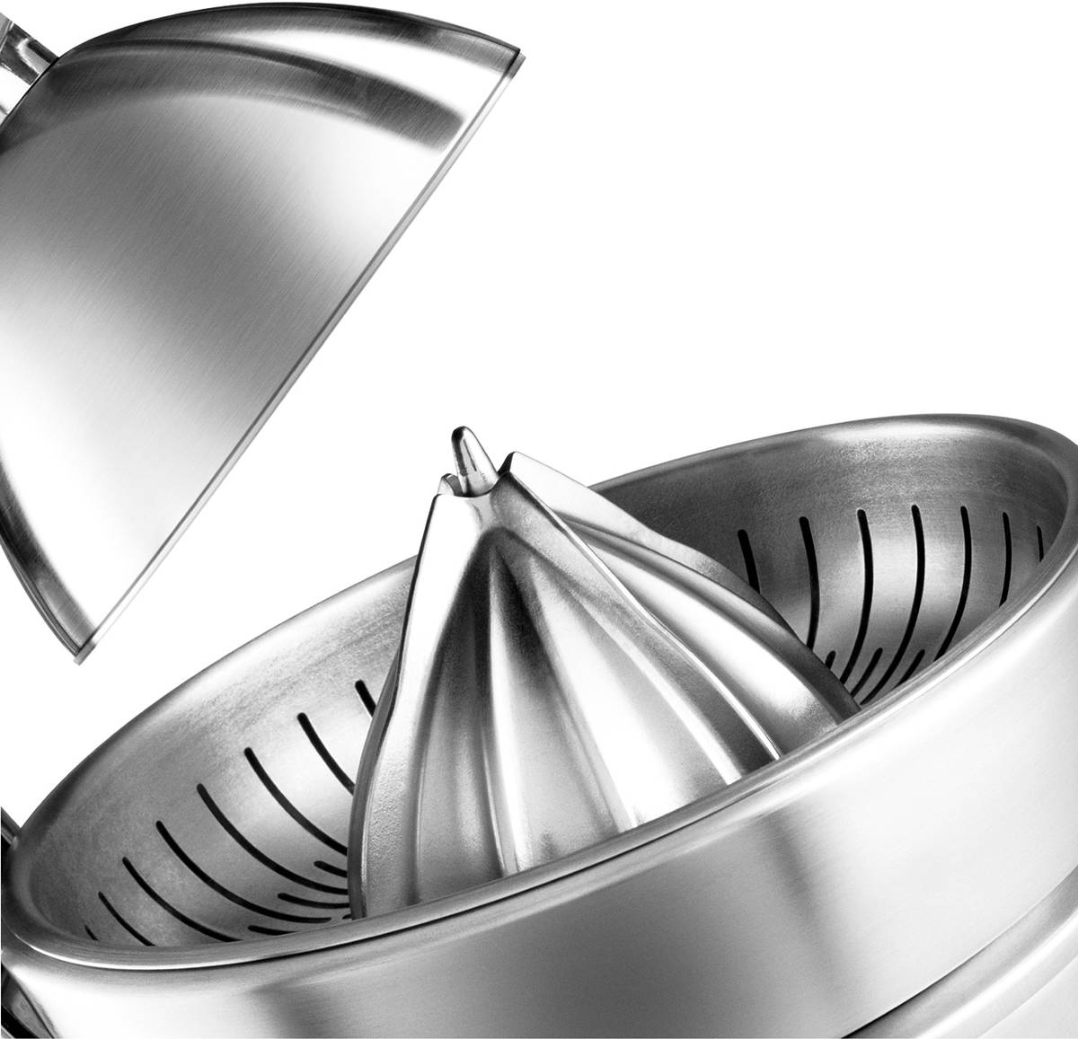 Silnik o mocy 110 W pracuje niezwykle szybko i cicho, przetwarzając wszystkie rodzaje owoców cytrusowych. Podczas wyciskania cytryn, pomarańczy lub grejpfrutów specjalne zaprojektowane ramię prasy do wyciskania i stożek wyciskający zapewniają uzyskanie maksymalnej ilości soku niezależnie od wielkości owocu.