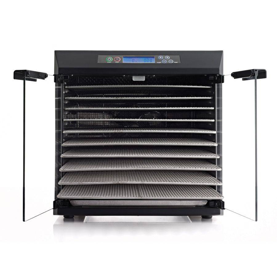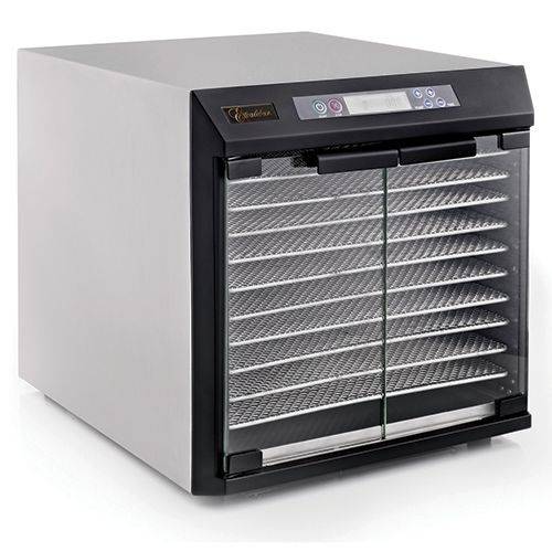 Suszarka ze stali nierdzewnej Excalibur EXC10EL świetnie nadaje się do suszenia większych ilości produktów. Suszarka ta ma dziesięć dużych tac do suszenia o łącznej powierzchni 1,45 m2. Suszarkę wyposażono także w wentylator o średnicy 16,5 cm, silnik o mocy 600 W i regulowany termostat. Obudowa i półki do suszenia wykonane są z higienicznej stali nierdzewnej, zaś drzwiczki – ze wzmocnionego szkła umożliwiającego obserwowanie procesu suszenia. Wszystkie elementy są produkowane i montowane w Stanach Zjednoczonych.
